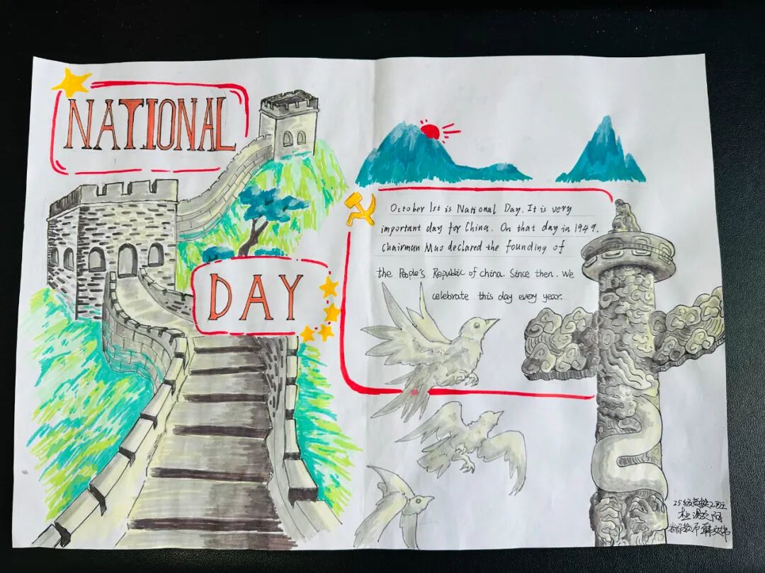 在金风送爽、丹桂飘香的美好时节,我们满怀激动与喜悦,迎来了祖国母亲的又一个生日。为庆祝2025年国庆节,山东民族技师学院举办了一场别开生面的庆国庆手抄报班级活动,用青春笔触绘就爱国深情,用缤纷色彩礼赞盛世中华。活动中,同学们积极投入,充分发挥各自的想象力与创造力。有的同学精心描绘天安门广场,庄重的华表、飘扬的红旗、巍峨的城楼,每一笔都饱含对祖国的无限敬意,让我们仿佛看到了国庆大典的盛大场面;有的同学聚焦祖国的壮丽山河,奔腾的黄河、雄伟的长城、秀丽的桂林山水,勾勒出祖国幅员辽阔、山河如画的盛景,展现出祖国大地的雄浑与壮美。